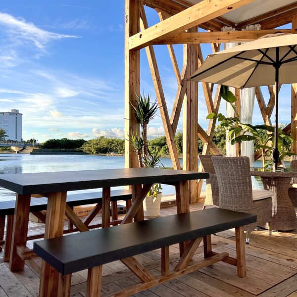 海水・潮風・日光・湿気など、屋外に近い環境下でも長持ちする屋外対応家具を採用